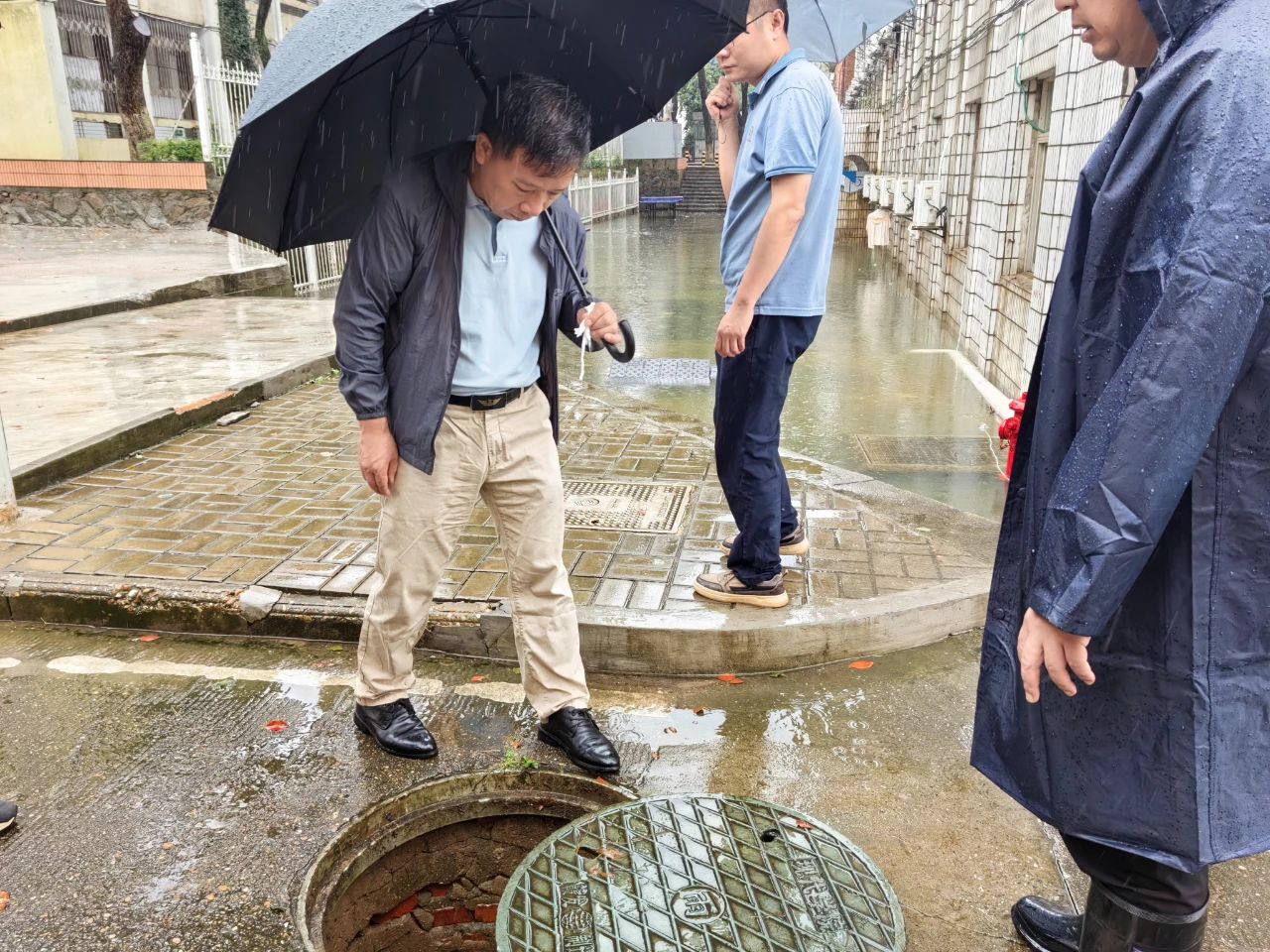 26日,因连续暴雨,9栋低洼区域积水位居高不下,罗来松再次深入一线,实地察看水位水势,叮嘱要时刻绷紧安全度汛这根弦,加强巡查频次,对校舍建筑、设备设施、在建工程、临时建筑等进行全面摸排、制定隐患清单,做好排查整改,守住安全底线,切实保障师生安全。刘英紧急协同全体后勤管理处、物业公司相关人员,聚众智、汇群力现场研究积水根治方法,最终确定了“抽水+排水”相结合的处置方案。