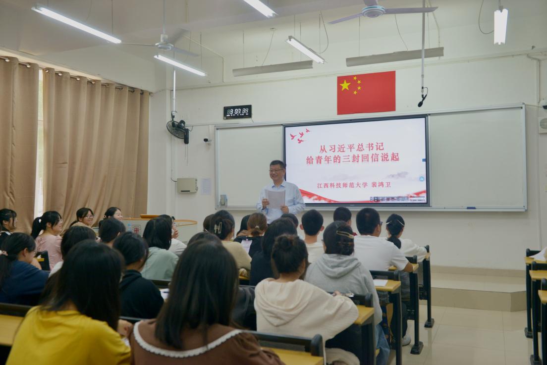 10月27日下午,江西科技师范大学党委书记裴鸿卫走进马克思主义学院,以“从习近平总书记给青年的三封回信说起”为题,为该院思想政治教育一班的同学们讲授了一堂生动的思政课。