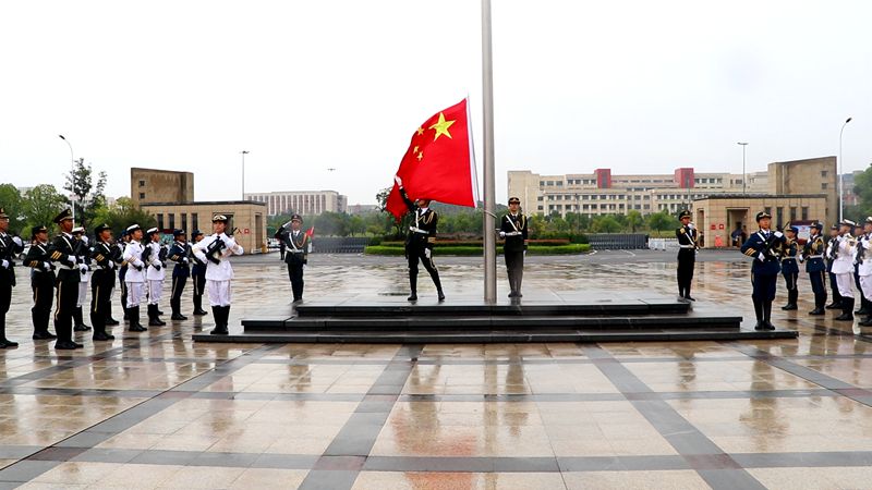 天空虽飘起细细秋雨,但近千名师生还是早早来到青春广场。随着国旗护卫队指挥员一声清亮的口号,雄壮的国歌响起,擎旗手高高扬起国旗。现场师生高唱国歌,面向国旗行注目礼。