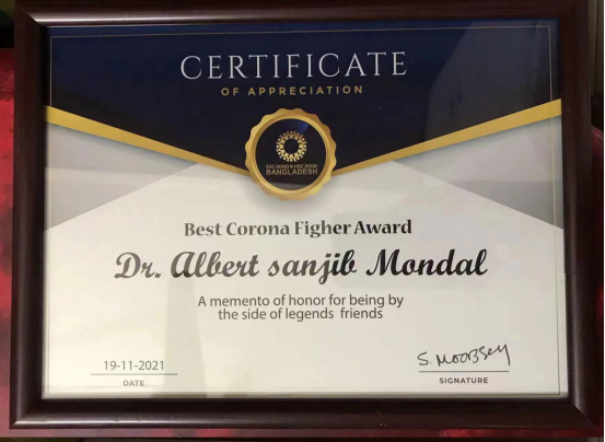 Albert Sanjib Mondol(以下简称阿尔伯特)是赣南医学院孟加拉国籍2018级呼吸系统疾病专业研究生,受新冠肺炎疫情影响,他于2020年2月回到孟加拉国。回国后,阿尔伯特充分运用自己的专业知识助力疫情防控和提供医疗咨询服务。截至2021年12月,他在孟加拉国已为1500多名病人提供在线治疗咨询服务,帮助了众多贫穷无助的患者,为抗击新冠肺炎疫情作出了积极贡献,得到了当地政府和非政府医疗组织的褒奖与表彰,荣获“抗击新冠肺炎最佳医生”荣誉称号,现在阿尔伯特被孟加拉国多个医疗组织和基金会选为成员继续为新冠肺炎防控服务工作。