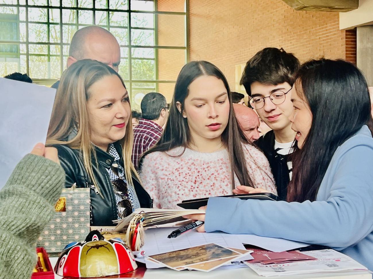 在卡斯蒂利亚拉曼查大学孔子学院展台前,孔子学院中外方院长和老师们热情地向前来参观的学生和家长们介绍来自中国的展品和中国文化的魅力,分享孔子学院丰富多彩的课程和活动。