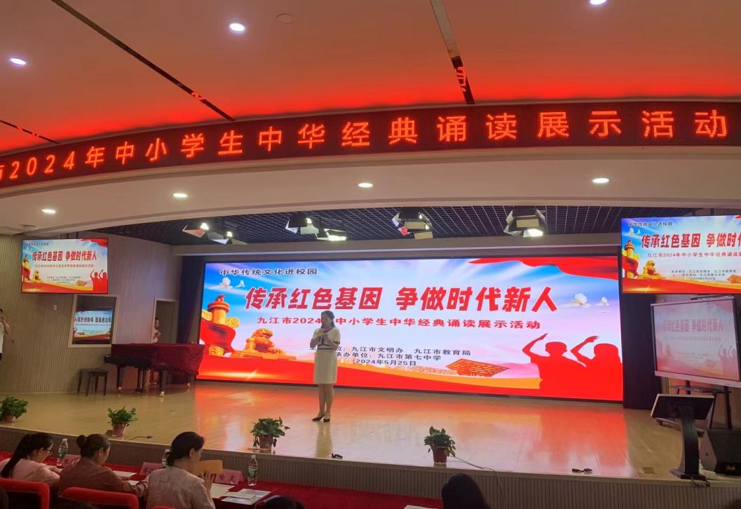 为深入贯彻习近平总书记关于语言文字工作和传承弘扬中华优秀传统文化的重要指示批示精神,践行习近平总书记关于“推进红色基因传承”的重要要求,积极培育和践行社会主义核心价值观,深化爱国主义教育,落实立德树人的根本任务,全面加强我市未成年人思想道德建设工作,推广和规范使用国家通用语言文字,5月25日上午,九江市举办了全市2024年中小学生中华经典诵读展示比赛活动。此次活动由九江市文明办和九江市教育局主办,九江市第七中学承办。