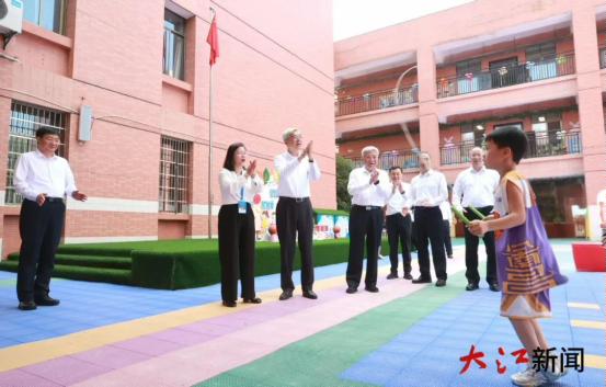 豫章师范学院附属安义板溪小学是一所乡村小学。尹弘来到学校,孩子们给他佩戴上鲜艳的红领巾。操场上,学生们正在开展丰富多彩的社团活动。尹弘认真观摩,与孩子们一起探究水压火箭发射原理,鼓励大家积极参加社团活动,培养探知兴趣和团队协作精神。在实施优化义务教育资源配置改革后,学校接收了周边3所撤并校的学生和老师,尹弘仔细询问师生学习生活情况,要求持续提升教育服务质效,解决交通出行、食宿保障等问题,全力促进义务教育优质均衡发展。